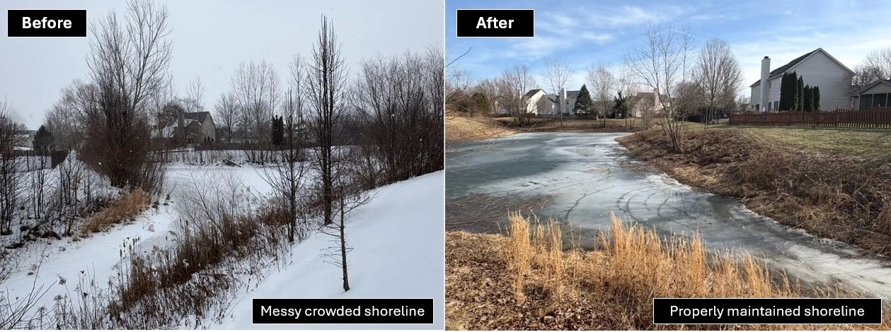 Invasive trees were identified throughout the buffer and cut or sprayed depending on treatment. Material was hauled off, and the remaining shoreline area was cleared of poorly maintained vegetation.